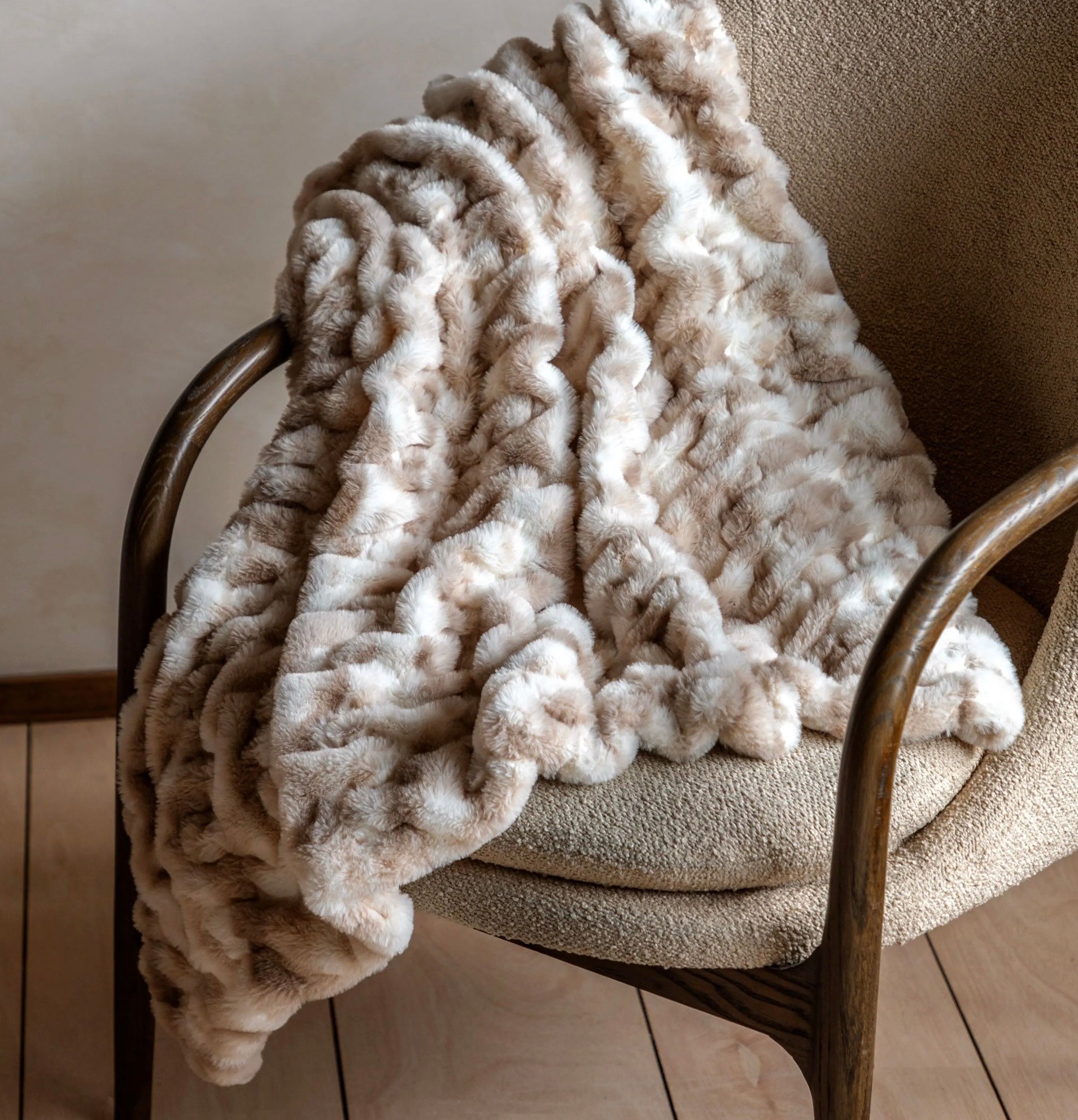 Sumptuously soft, this faux rabbit fur throws brown and white marble pattern and ruched texture design will add cosy luxury to any home this winter.