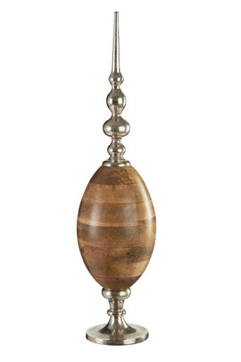 Orsina merges cool metal with warm timber in the Hampstead aluminium large obelisk ornament. A nickel-coated aluminium body rises to a crisp point, anchored by a mango wood base that introduces natural grain and colour.