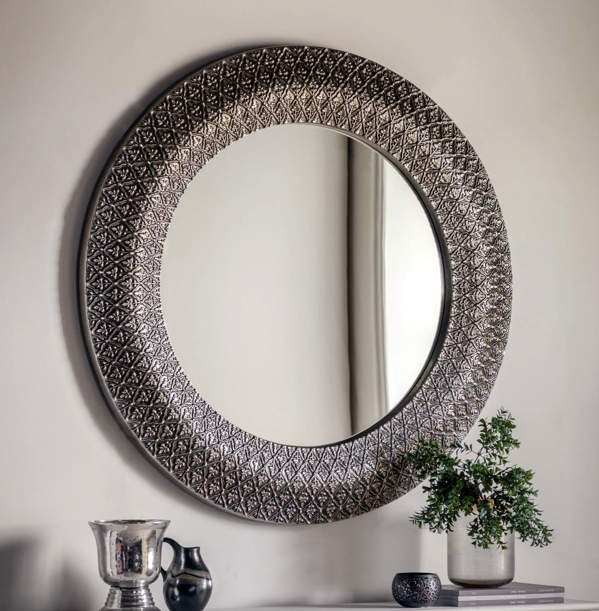 Overflowing with detail this beautiful round mirror will add a little charm to any room. The pewter toned metal frame features beautifully intricate filigree detailing with an Indian influence, creating a stunning stand out mirror you won't be a ble to take your eyes off.