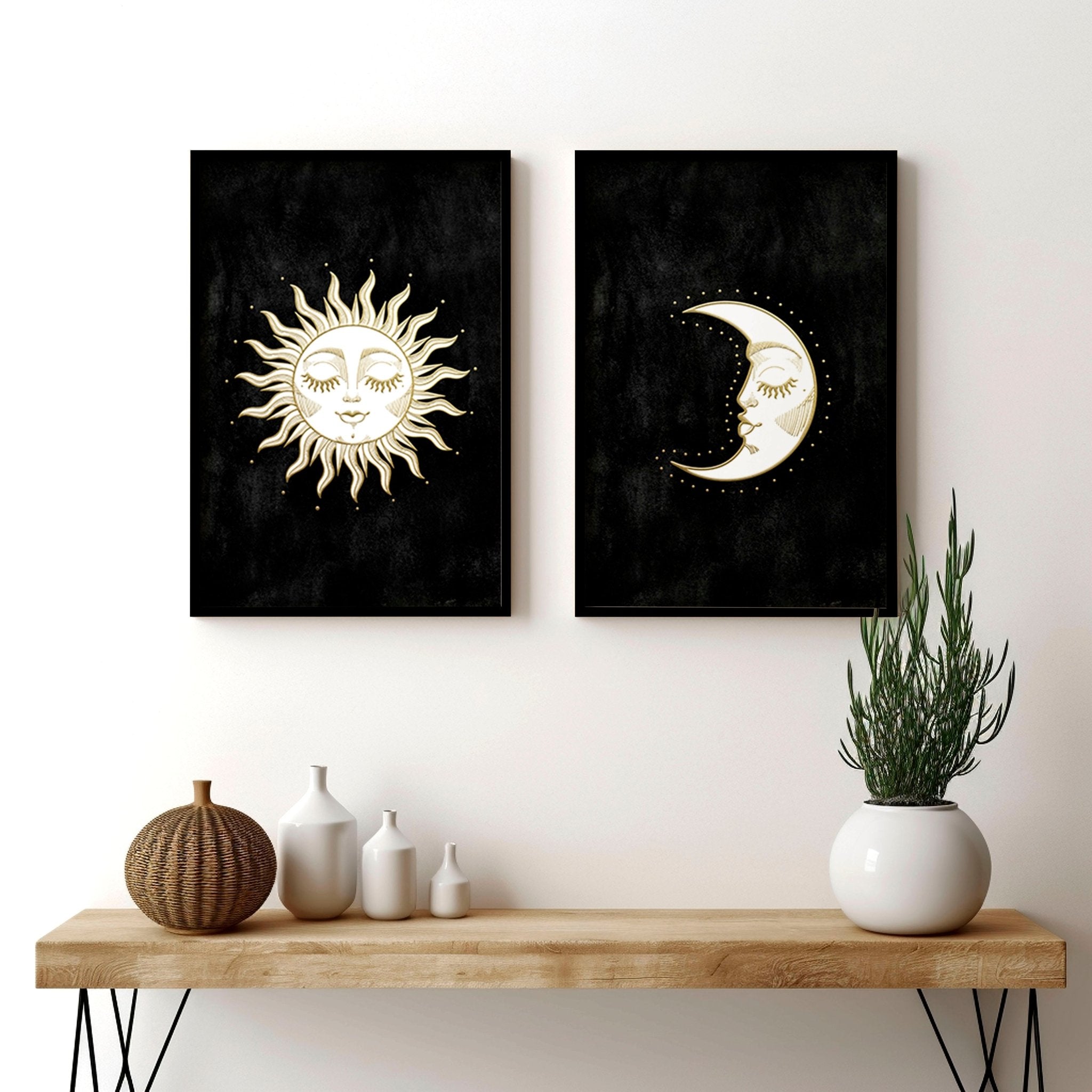 Elevate your home decor with our captivating set of two Sun and Moon large prints for the living room. It is designed to infuse your space with celestial charm and mystical allure. Each print features intricate depictions of the sun and moon, symbolizing balance, harmony, and the cyclical nature of life.