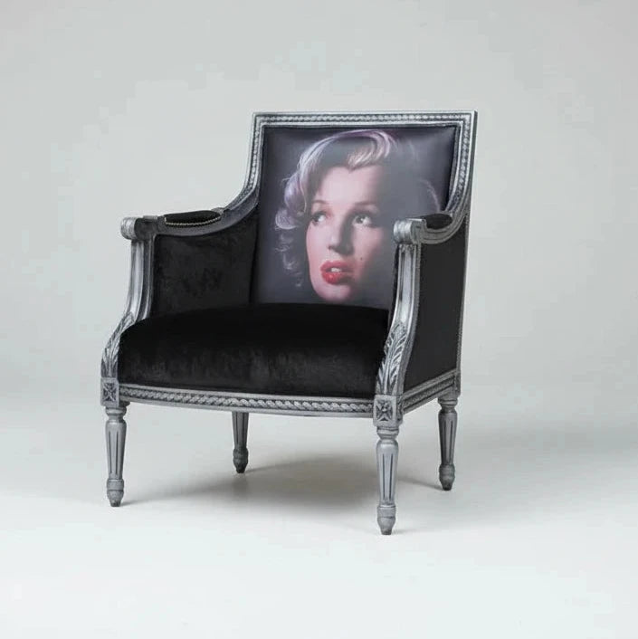 Hand made exclusively by us this collaboration with uk artist Paul Karslake is a limited edition of 25 pieces worldwide and is handmade in the uk with printed faux leather with Pauls legendary artwork "Crying Marilyn" with faux seal fur arms and seat and glitter metallic faux leather on outside panels - the Louis XVI style chair is painted in aged silver black hand finished with silver hand stud work.
