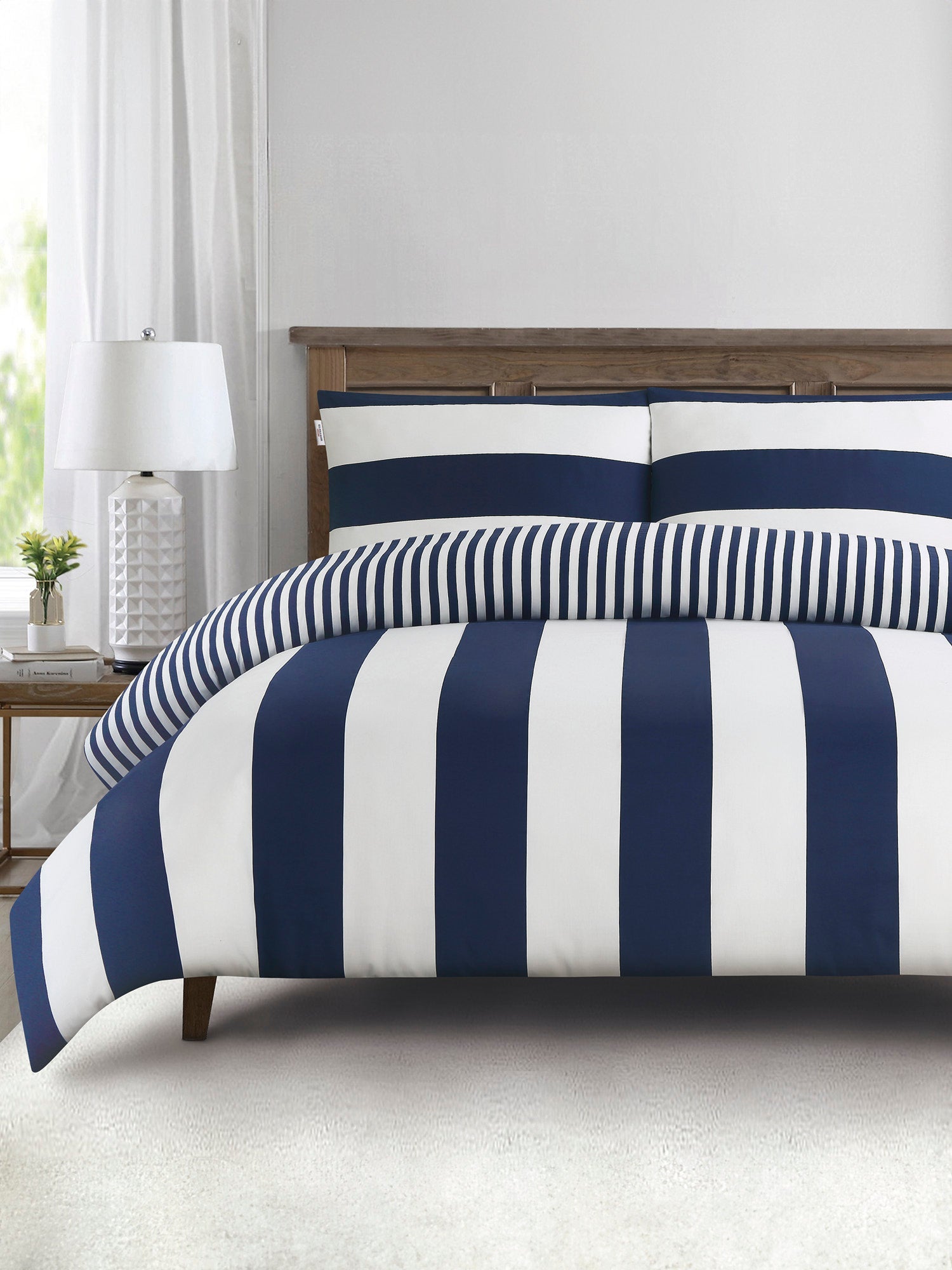 Pure Cotton Block Stripe Duvet Set in Navy Iris