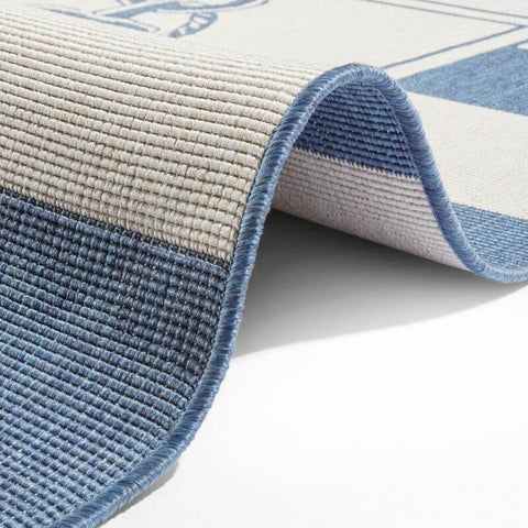 Set sail in style with the Gandara Reversible Flatweave Rug, the perfect blend of coastal charm and durable practicality. Designed with blue and white marine stripes and a striking anchor motif at the centre, this weather-resistant rug adds a bold nautical flair to your space. Its flatweave construction ensures durability, while the reversible design doubles its lifespan and versatility.
