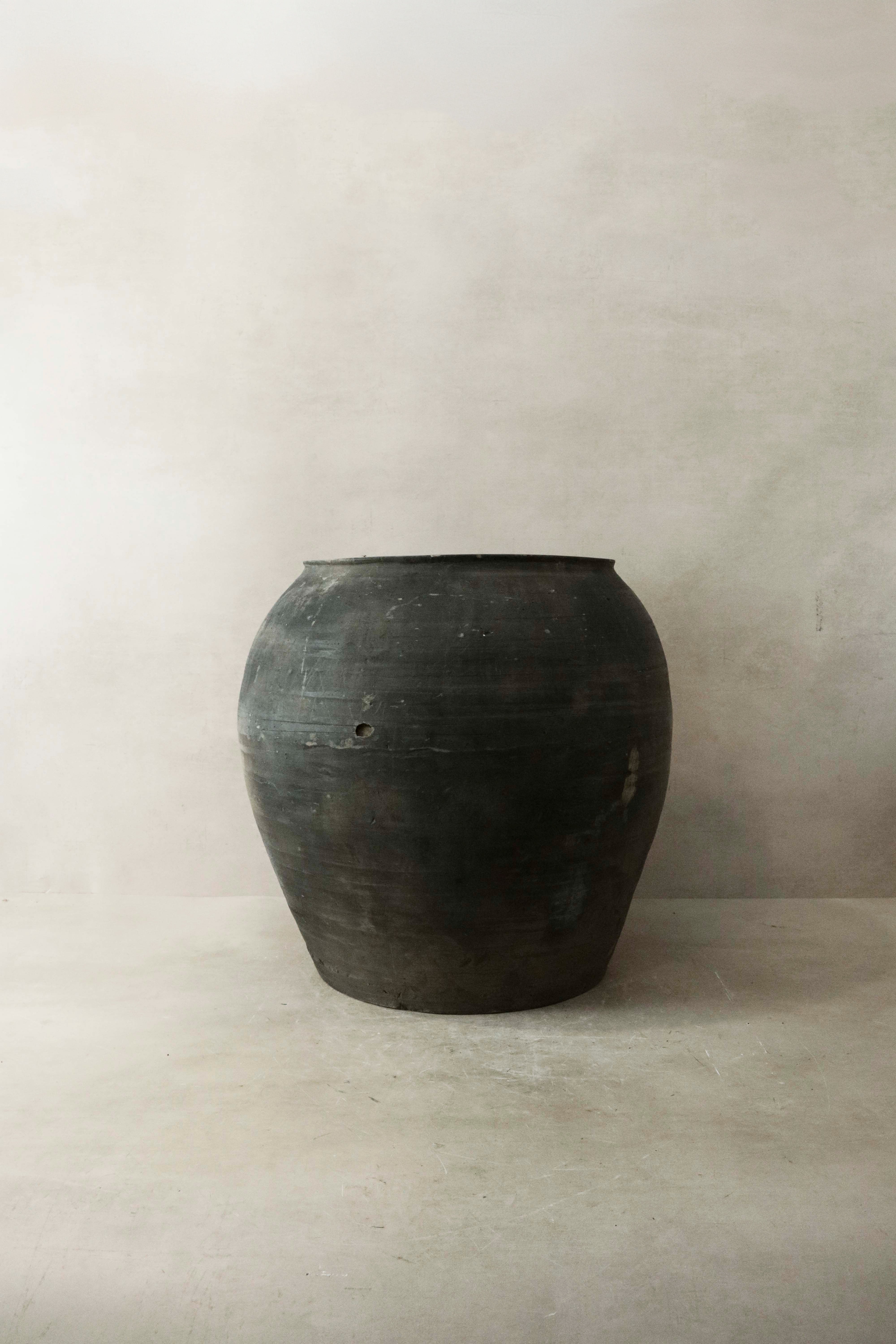 Vintage dark grey earthenware pot with signs of aging. These pots are hand made and are very decorative. They have a beautiful patina due to age. They are from the Shanxi province and crafted c. 1950's.