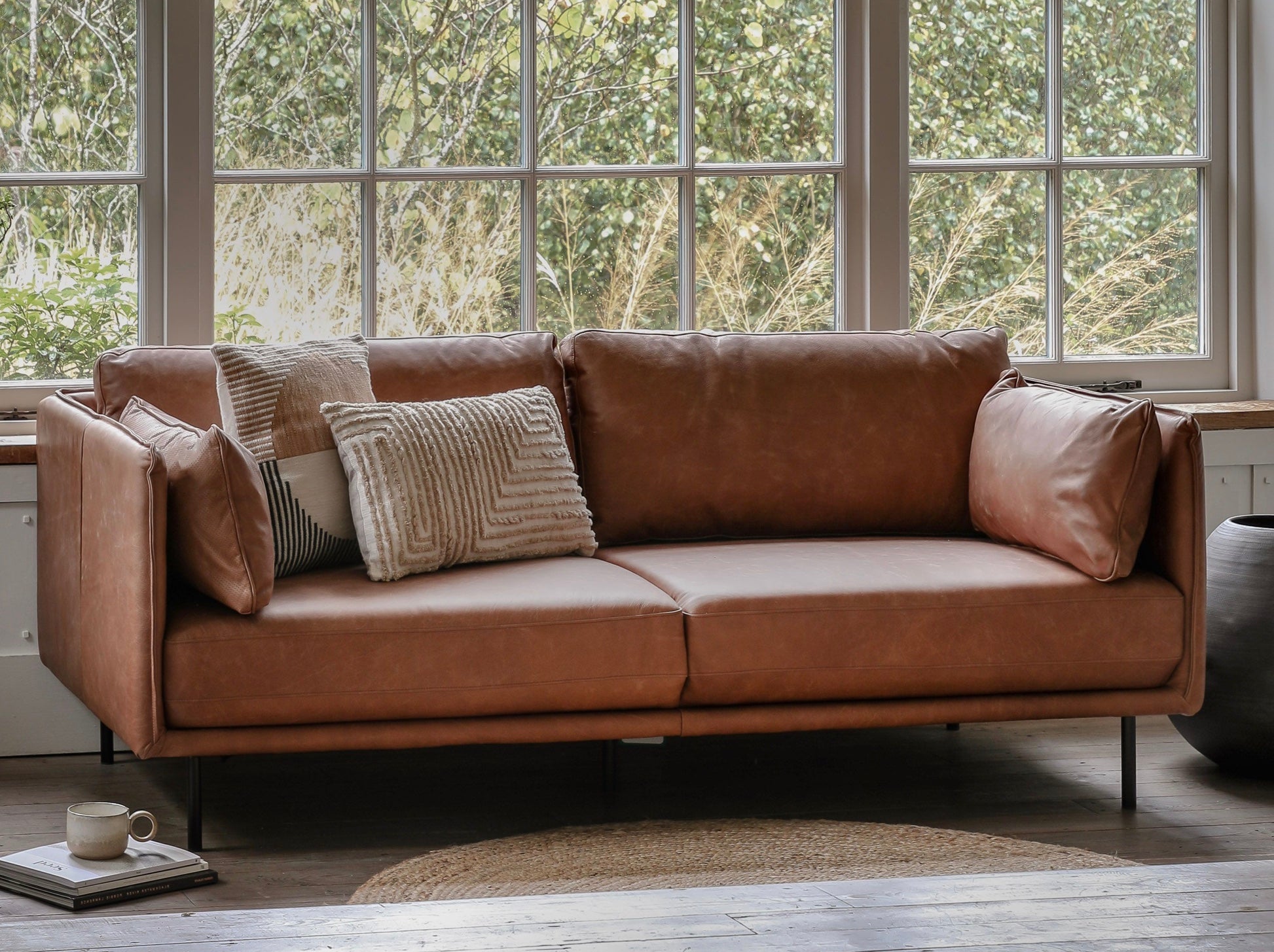 Offering a sleek contemporary look, this stylish sofa is fully upholstered in a lovely warm brown leather, with black metal legs perfectly complementing the design. The slim arms feature stitch seam detailing which is echoed on the side cushions.