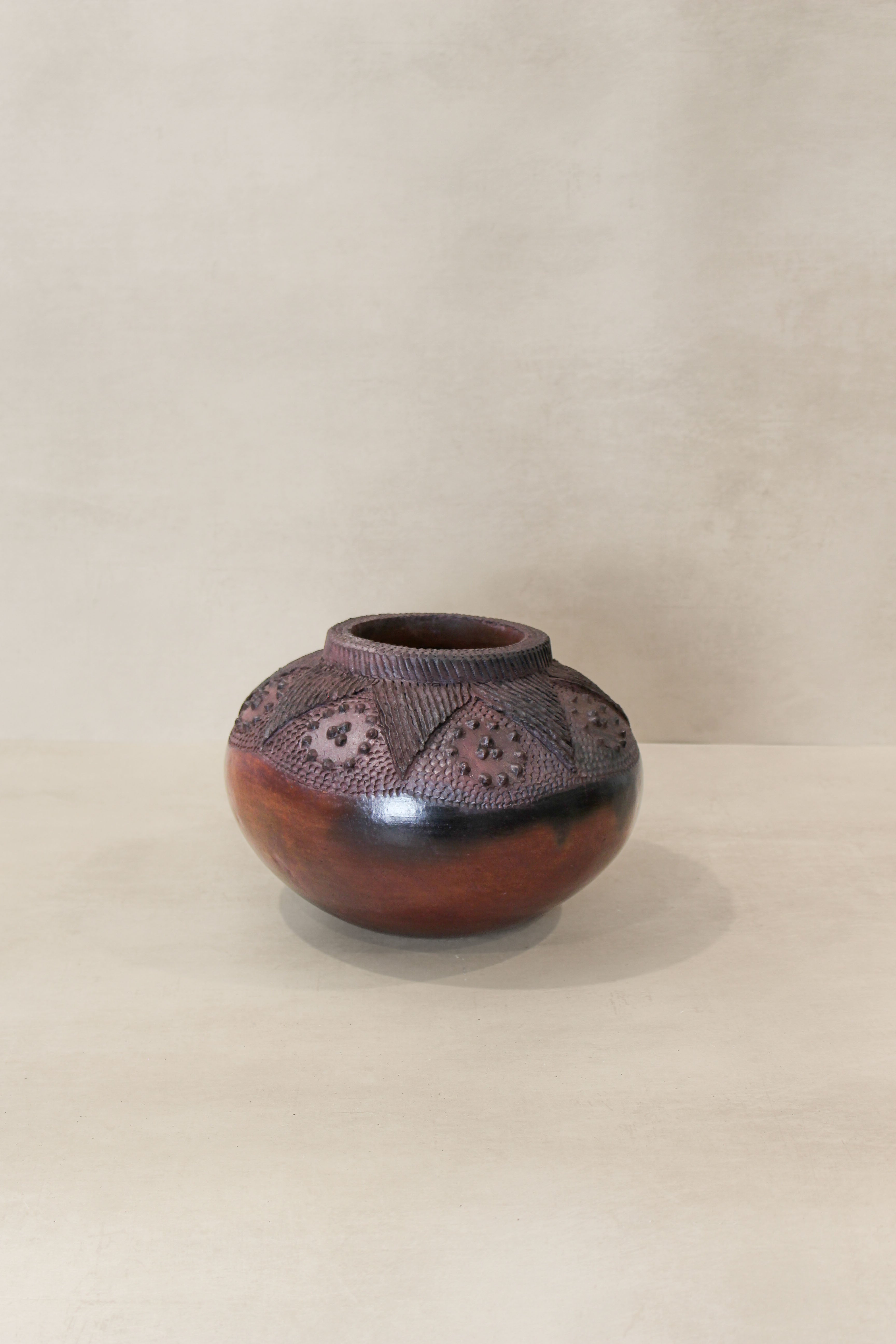 The Zulu pot, originating from South Africa, holds a distinguished role in the traditional practices of the Zulu people, primarily as vessels for the storage and consumption of beer. Crafted meticulously from clay harvested from the banks of local rivers, these pots undergo a meticulous hand-shaping process, followed by careful smoothing, culminating in firing over open-air fire pits. This time-honored technique not only imparts durability but also infuses each vessel with a distinctive character reflective of its artisan's cultural heritage, rendering every pot a unique testament to the rich tapestry of Zulu tradition.